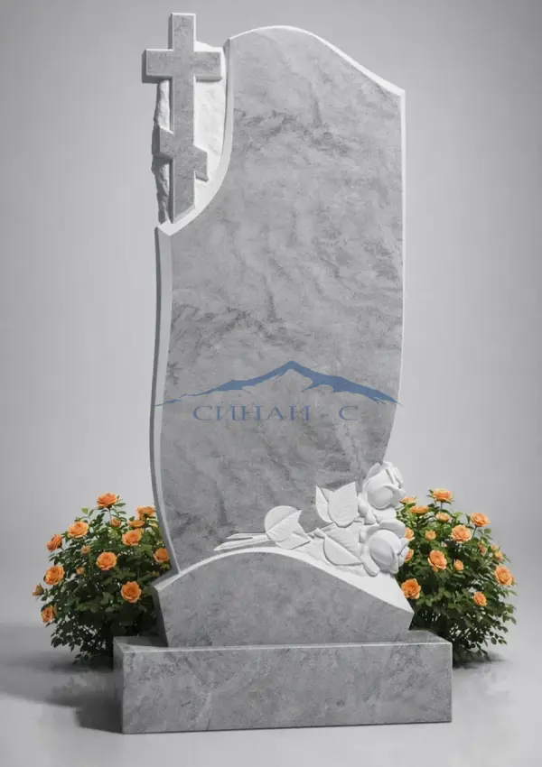 Мраморный памятник с крестом и розами выполнен из светлого натурального мрамора и отличается изящной фигурной формой. Православный крест в верхней части символизирует веру, духовную защиту и вечную память о близком человеке. Резная композиция из роз в нижней части передаёт чувства любви, скорби и уважения, подчеркивая значимость утраты. Плавные линии и сочетание гладкой поверхности с декоративными элементами создают гармоничный и благородный образ. Стела подходит для нанесения гравировки с именами, датами и изображениями, позволяя создать индивидуальный мемориал, отражающий светлую память о близком.