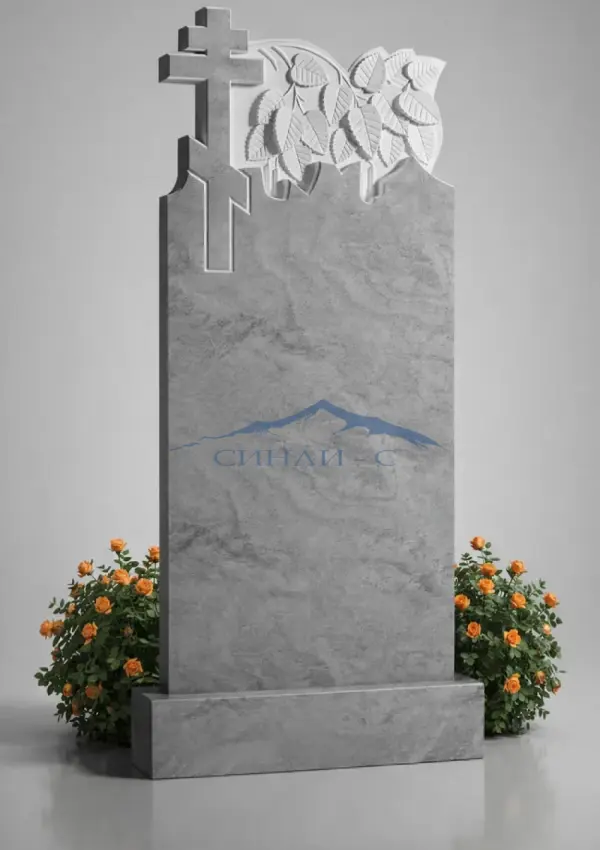Мраморный памятник с крестом и декоративной резьбой выполнен из светлого натурального мрамора и отличается строгой и одновременно выразительной композицией. Православный крест в верхней части символизирует веру, надежду на вечную жизнь и духовную связь с ушедшим человеком. Резной орнамент в виде листьев придает памятнику мягкость и природную гармонию, подчеркивая светлую память и уважение. Плавная форма стелы и сочетание гладкой поверхности с художественными элементами создают аккуратный и благородный внешний вид. Стела подходит для нанесения гравировки с именами, датами и изображениями, позволяя создать индивидуальный мемориал.
