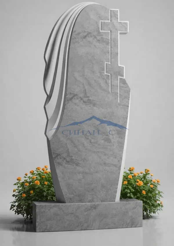 Мраморный памятник с православным крестом выполнен из натурального светлого мрамора, отличающегося благородной текстурой и эстетичной поверхностью. Рельефный крест символизирует веру, духовную защиту и вечную память об ушедшем человеке. Плавные линии стелы и изящный драпированный элемент сбоку создают ощущение мягкости и гармонии, придавая композиции утончённый и современный вид. Сочетание строгой формы и декоративных деталей делает памятник выразительным и достойным. Возможна гравировка, позволяющая нанести имена, даты или изображения, создавая индивидуальное мемориальное оформление.