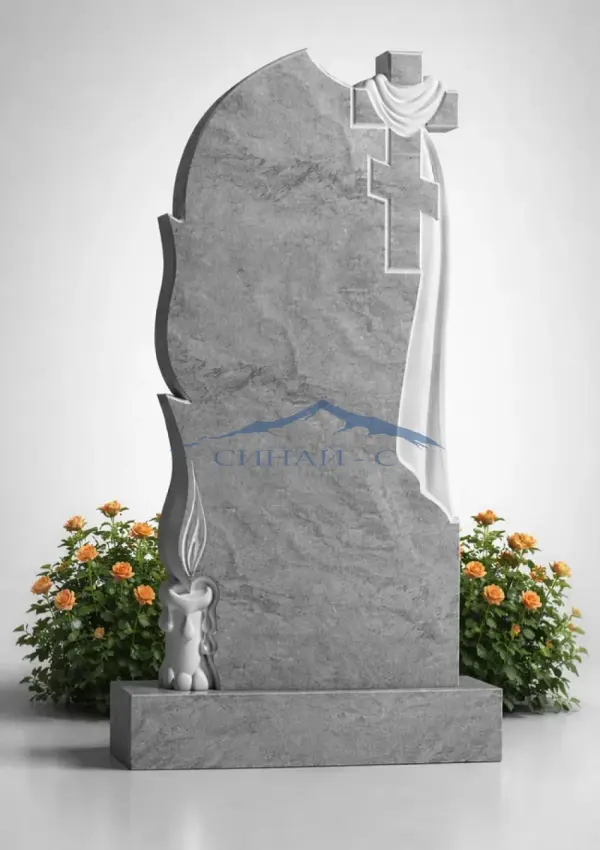 Мраморный памятник с крестом, драпировкой и свечой выполнен из натурального светлого мрамора, придающего изделию благородный и выразительный вид. Православный крест символизирует веру, надежду и вечную жизнь, а изящная драпировка подчеркивает скорбь и память о близком человеке. Декоративный элемент в виде свечи у основания олицетворяет вечность души и духовную связь с ушедшим. Плавные линии и художественная резьба создают гармоничную композицию, наполняя памятник глубоким смыслом. Возможна гравировка имен, дат или изображений для создания индивидуального мемориального оформления.