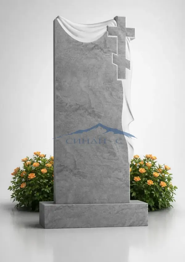 Мраморный памятник с православным крестом и драпировкой выполнен из натурального светлого мрамора, отличающегося мягкой текстурой и изящным внешним видом. Крест символизирует веру, вечную жизнь и духовную память, а декоративная драпировка подчеркивает скорбь и уважение к ушедшему человеку. Плавные линии стелы и гармоничное сочетание строгой формы с художественными элементами создают спокойный и выразительный образ. Лаконичный дизайн делает памятник универсальным и эстетичным решением. Возможна гравировка имен, дат или изображений, что позволяет создать индивидуальное мемориальное оформление.