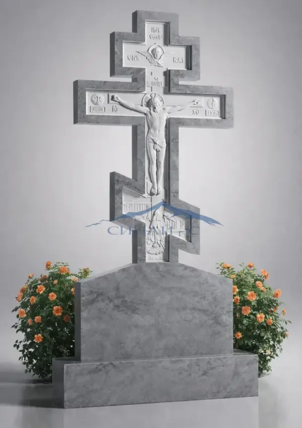 Мраморный памятник с крестом и распятием выполнен из натурального светлого мрамора, придающего изделию благородный и выразительный вид. Центральное место занимает рельефное изображение распятия, выполненное с высокой детализацией, что подчеркивает глубокий духовный смысл и символ веры. Крест с проработанными элементами олицетворяет надежду на вечную жизнь и связь души с небесным миром. Гармоничная форма стелы и аккуратные линии создают строгую и торжественную композицию. Возможна гравировка имен, дат или изображений, что позволяет создать индивидуальный и уникальный памятный знак.