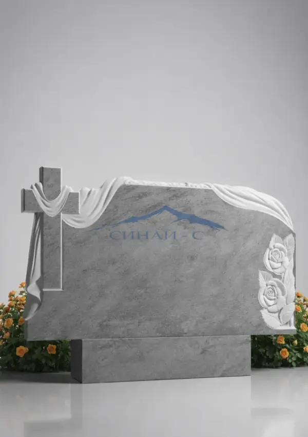Мраморный горизонтальный памятник с крестом и розами выполнен из натурального светлого мрамора, придающего изделию благородный и сдержанный вид. Декоративная драпировка в верхней части символизирует скорбь и память, а крест олицетворяет веру, надежду и вечную жизнь. Рельефные розы, выполненные с высокой детализацией, выражают любовь, уважение и светлую память о близком человеке, подчеркивая эмоциональную глубину композиции. Плавная форма стелы создает гармоничный и спокойный образ. Возможна гравировка имен, дат или изображений, что позволяет создать индивидуальный мемориальный памятник.