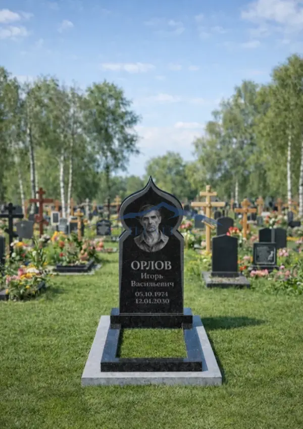 Гранитный памятник «Мусульманский 23» выполнен в строгой вертикальной форме с выразительным завершением в виде традиционного восточного силуэта. Плавные очертания верха придают стеле архитектурную завершённость и подчёркивают религиозный характер композиции. Материал — прочный чёрный гранит с полированной лицевой поверхностью, устойчивый к перепадам температуры и осадкам. Модель подходит для индивидуального захоронения, предусматривает нанесение надписей, дат, эпитафии и религиозной символики методом гравировки.