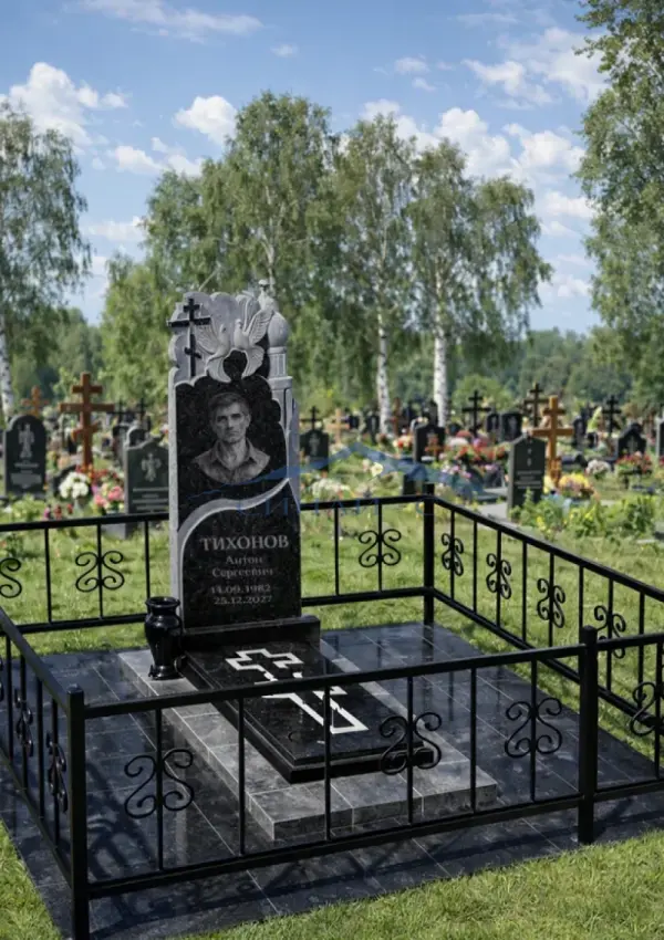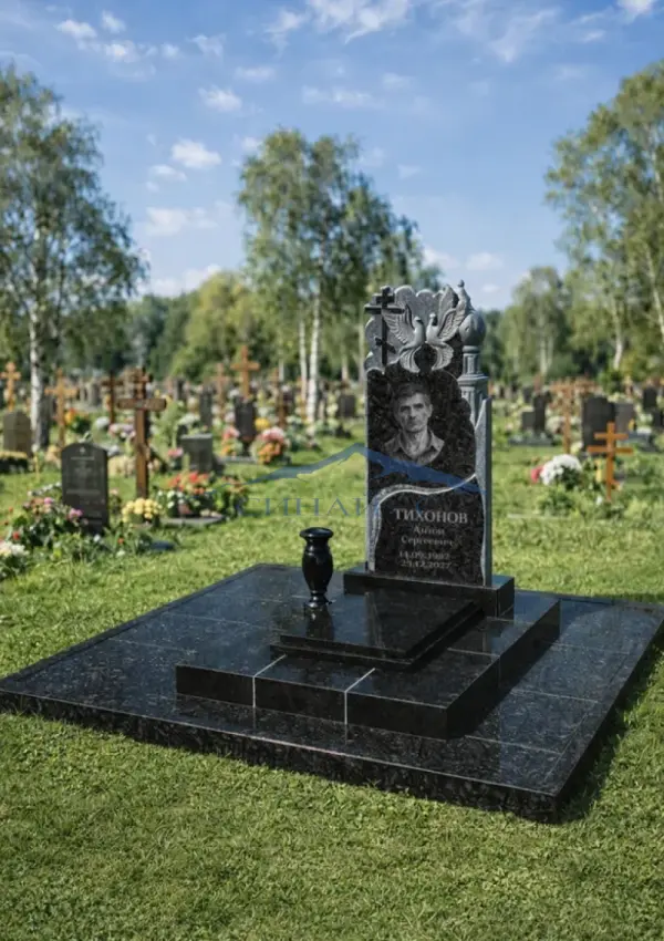 Гранитный памятник «Голубки и купол» выполнен в вертикальной форме из полированного чёрного гранита с контрастными светлыми элементами. Верхняя часть композиции украшена изображением православного креста и парящих голубей, символизирующих чистоту души, мир и надежду на вечную жизнь. Сбоку расположен силуэт купола храма, подчёркивающий духовную направленность модели. Плавные линии придают стеле гармоничный силуэт, сохраняя строгий и сдержанный характер. Памятник подходит для индивидуального захоронения. Возможна гравировка портрета, ФИО, дат и памятных надписей.