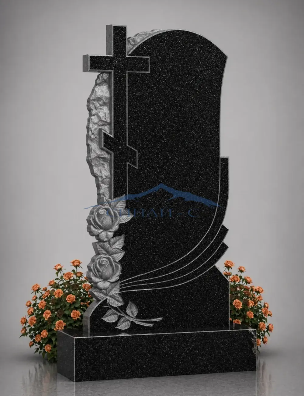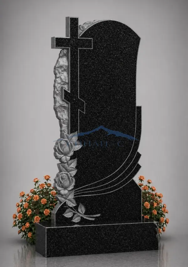 Гранитный памятник с крестом и розами изготовлен из высококачественного черного гранита. Изображение креста, выполненное с четкой и аккуратной резьбой, символизирует веру, духовную связь и вечную жизнь. Декоративные розы с проработанными лепестками и листвой символизируют любовь, память и уважение к ушедшему. Фактурный элемент, имитирующий природный камень, придает композиции дополнительную глубину и выразительность. Плавные линии формы и контраст светлой резьбы и темного камня создают гармоничный и завершенный внешний вид. Также возможна гравировка, которая позволяет персонализировать памятник с именами, датами или изображениями.