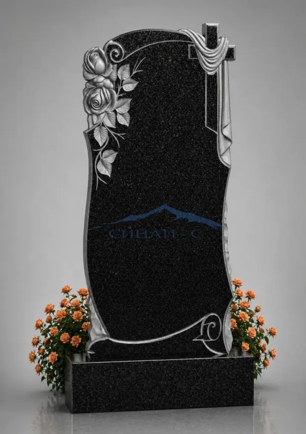 Гранитный памятник «Светлая память» выполнен из чёрного полированного гранита с выразительным декоративным оформлением. Композиция сочетает в себе изящные розы, символизирующие любовь и тёплые воспоминания, и православный крест с мягкой драпировкой, олицетворяющий веру и духовную защиту. Плавные линии и декоративные элементы по краям придают памятнику лёгкость и визуальную гармонию, создавая ощущение завершённости и спокойствия. Контраст светлого резного декора и тёмной поверхности подчёркивает глубину и аккуратность исполнения. Такой памятник подойдёт для тех, кто хочет выразить уважение, сохранить память и передать искренние чувства в сдержанной и благородной форме. Возможна индивидуальная гравировка, подбор размеров и оформление под пожелания заказчика.