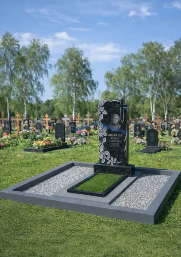 Гранитный памятник выполнен в классической вертикальной форме с мягко очерченным верхним краем. Левая сторона стелы украшена изящной композицией из роз и листвы, которая плавно проходит вдоль края и образует декоративную кайму. В верхней правой части размещён крест, подчёркивающий духовную символику оформления. Контраст светлых элементов и тёмной полированной поверхности создаёт выразительный и аккуратный внешний вид. Памятник установлен на прочном основании, обеспечивающем устойчивость конструкции. Лицевая часть остаётся просторной для размещения портрета, имён, дат и памятных надписей, сохраняя гармонию и торжественность композиции.