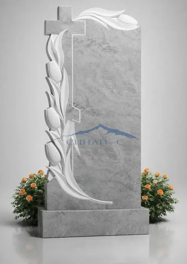 Мраморный памятник с крестом и тюльпанами выполнен из светлого натурального мрамора и отличается изящной фигурной композицией. Православный крест в верхней части символизирует веру, духовную защиту и вечную память. Декоративная резьба в виде тюльпанов по боковой части придаёт памятнику особую выразительность и символизирует чистоту, любовь и уважение к ушедшему человеку. Плавные линии и сочетание гладкой поверхности с художественными элементами создают гармоничный и благородный образ. Стела подходит для нанесения гравировки с именами, датами и изображениями, позволяя создать индивидуальный мемориал, отражающий память о близком.