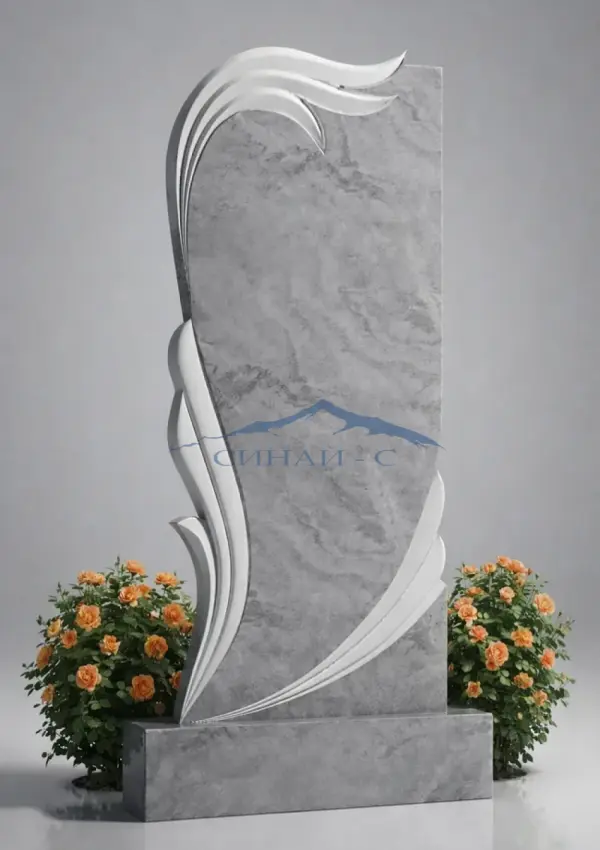Мраморный памятник выполнен из светлого натурального мрамора и отличается современной асимметричной формой с плавными изогнутыми линиями. Декоративные элементы, обрамляющие стелу, создают эффект движения и легкости, символизируя течение времени, память и духовное возвышение. Плавные формы придают памятнику особую выразительность и гармонию, формируя спокойный и благородный образ. Сочетание гладкой поверхности и художественных деталей подчеркивает естественную текстуру камня и аккуратность исполнения. Стела подходит для нанесения гравировки с именами, датами и изображениями, позволяя создать индивидуальный мемориал, отражающий светлую память о близком человеке.