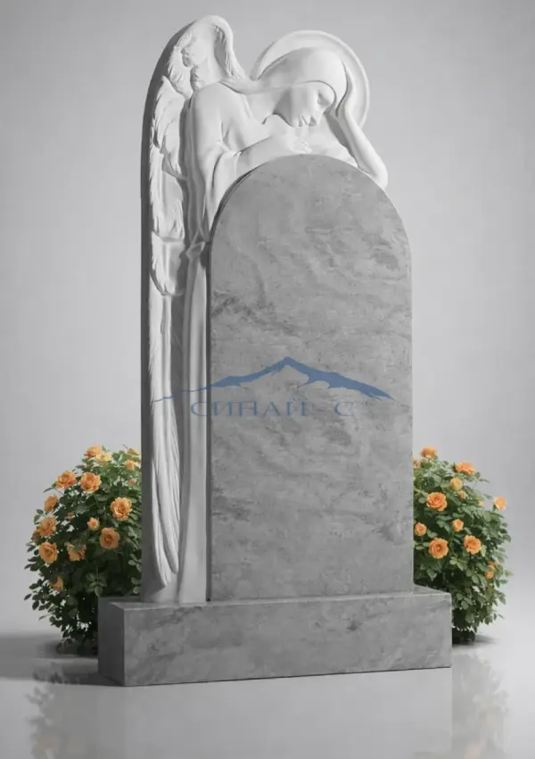 Мраморный памятник с ангелом выполнен из светлого натурального мрамора и отличается выразительной скульптурной композицией. Фигура скорбящего ангела, склонившего голову на стелу, символизирует глубокую печаль, любовь и вечную память о близком человеке. Образ ангела традиционно олицетворяет защиту души, духовное спокойствие и связь с высшими силами. Детальная проработка крыльев и складок одежды придаёт памятнику реалистичность и особую эмоциональную глубину. Плавная форма стелы гармонично дополняет композицию, а поверхность подходит для нанесения гравировки с именами, датами и изображениями, позволяя создать индивидуальный и достойный мемориал.