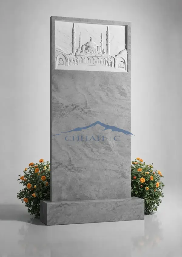 Мраморный памятник с рельефным изображением мечети выполнен из натурального светлого мрамора, подчеркивающего строгость и благородство изделия. Детализированная композиция с куполом и минаретами символизирует духовность, веру и связь человека с высшими ценностями, отражая традиции исламской культуры. Архитектурный рельеф выполнен с высокой точностью, создавая глубину и выразительность изображения. Лаконичная форма стелы гармонично дополняет декоративный элемент, формируя сдержанный и достойный образ. Возможна гравировка имен и дат, что позволяет создать индивидуальный памятный знак с учетом религиозных традиций.