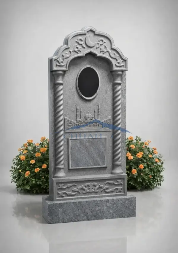 Мраморный памятник «Примирение» выполнен из светлого натурального мрамора и отличается выразительным архитектурным оформлением. Верхняя часть стелы выполнена в виде арки с декоративным орнаментом и полумесяцем, а витые колонны по бокам придают композиции торжественность и завершённость. Овальная вставка в центре предназначена для размещения портрета, а нижняя часть подходит для нанесения гравировки с именами и датами. Такой памятник символизирует уважение, память и духовное спокойствие, создавая гармоничный и благородный образ мемориала. Светлый мрамор подчеркивает чистоту линий и аккуратность исполнения, делая памятник достойным оформлением места захоронения.