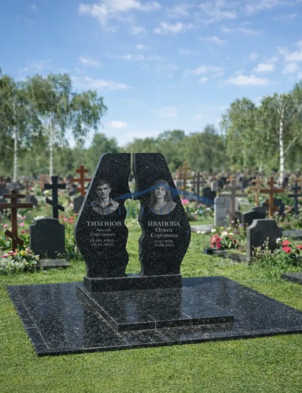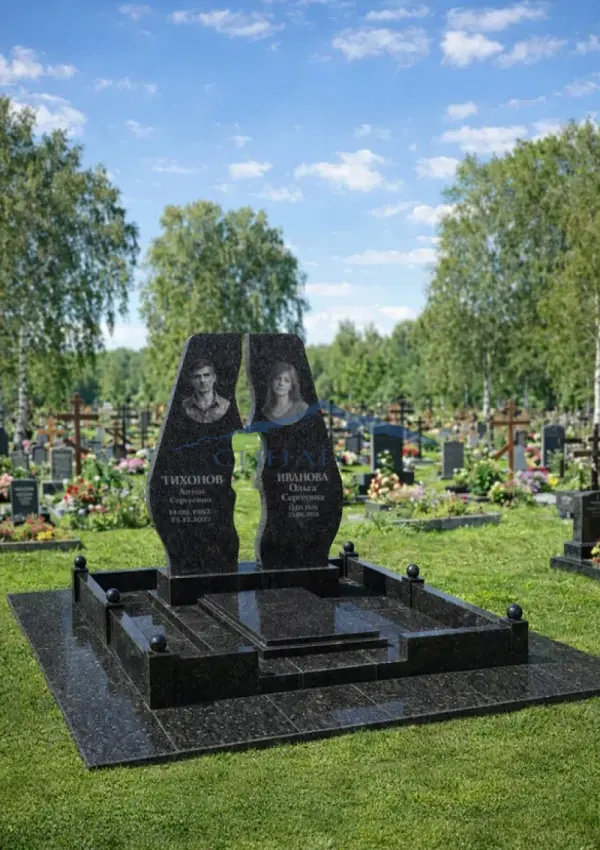Гранитный памятник «Свеча» выполнен в оригинальной композиции из двух вертикальных стел, образующих силуэт пламени в центральной части. Фигурная форма символизирует вечную память и неугасающий свет души. Модель изготовлена из прочного чёрного гранита с полированной лицевой поверхностью, что придаёт памятнику строгий и благородный вид. Центральный вырез визуально облегчает конструкцию и создаёт выразительный акцент. Памятник подходит для семейного захоронения — предусмотрено размещение двух портретов и надписей.