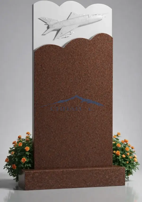 Гранитный памятник с изображением самолета изготовлен из высококачественного красного гранита. Стела имеет классическую прямую форму с мягкой волнообразной верхней линией, придающей композиции завершенность и выразительность. В верхней части размещен художественный барельеф самолета, символизирующий полет, свободу, память о профессии или жизненном пути человека. Такие элементы часто используются для увековечения памяти летчиков и людей, связанных с авиацией. Контраст теплого оттенка гранита и светлого декоративного элемента подчеркивает глубину композиции. Памятник отличается лаконичным и тематическим дизайном. Возможна гравировка имен, дат или изображений для индивидуального оформления.