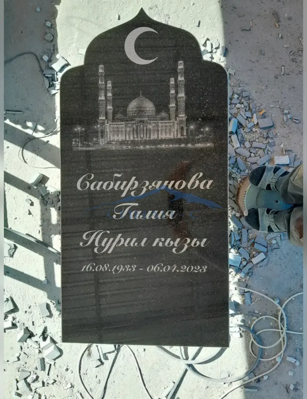 Гранитный памятник в форме мечети выполнен из высококачественного черного гранита, что гарантирует его долговечность. Особенностью является строгий и гармоничный дизайн с характерной арочной формой в верхней части, символизирующей традиции и духовное значение. Аккуратно выполненные детали делают памятник элегантным и символичным. Возможность гравировки позволяет добавить имена и даты, что делает памятник персонализированным.